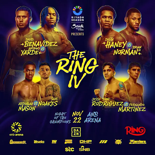 تستضيف الرياض Ring IV: ليلة الأبطال، بمواجهة نجم WBC ديفيد بينافيديز ضد أنتوني يارد، ونزال WBO بين نورمان جونيور وديفين هاني، بالإضافة إلى عودة جيسي “بام” رودريغيز.